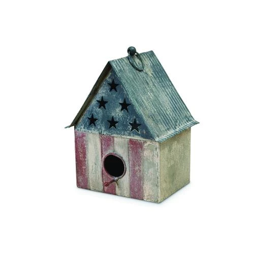 This antique metal bird house is sure to be a great addition to your garden. It features a rustic, distressed look paired with a patriotic design.