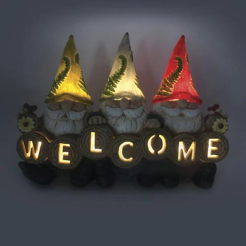 Add some charm to your garden, patio or yard with this adorable solar statue featuring several gnomes holding a Welcome sign. During the day, this energy-efficient solar powered statue utilizes the sunlight to charge its internal batteries. After dark, it will automatically turn on, emitting a soft attractive glow.