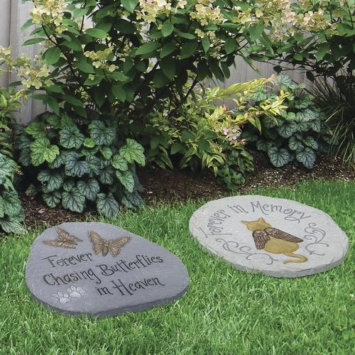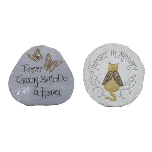 This 10 inch diameter decorative pet memorial stone is perfect for remembering an old friend. Features beautiful stone texture and angel wing etchings.