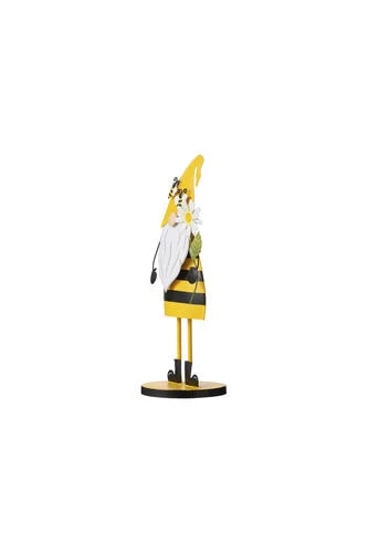 This gnome table decor is made of metal with a striped body and is holding a daisy. This can be used for both indoor and outdoor decoration.