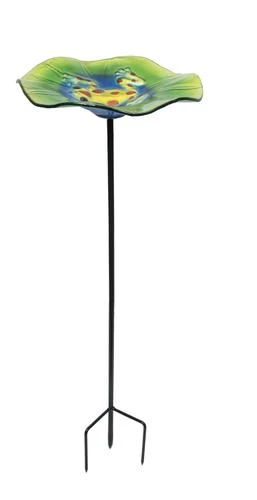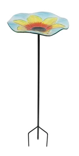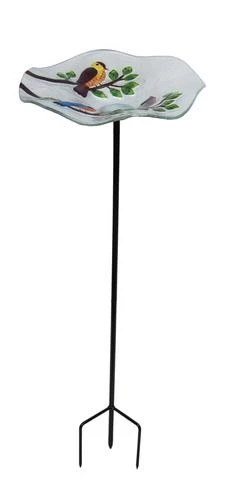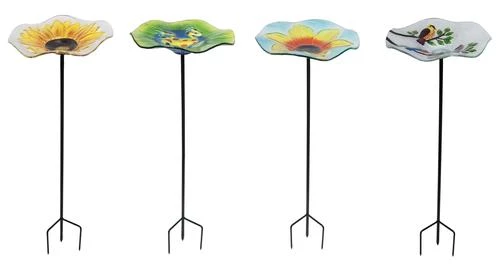 Brighten up your garden or yard with this beautifully detailed glass birdbath. Choose from 4 colorful embossed and painted design (each sold separately). Each bird bath measures 11″ diameter and stand 26″ tall with the stand (included). Made for outdoor use.