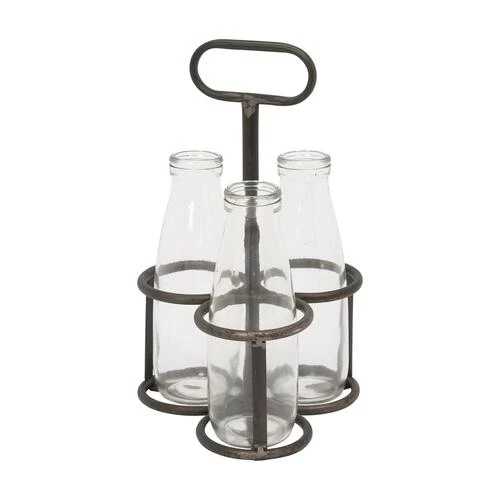 Enjoy this unique 12.4″L metal holder with 3 glass bottles. Add flower accents to spring into a new season.