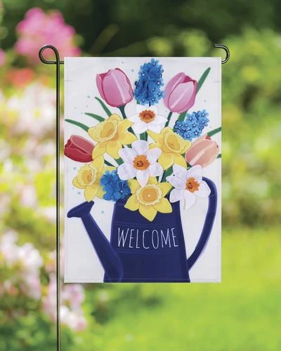 Decorate your garden with these colorful 12.5″ x 18″ applique flags. They are made of durable 310 denier nylon and stitched tightly to add dimension and durability! Choose from the following 6 bright and colorful designs: Spring Flower Watering Can Garden Burlap Applique Flag, I Love My Dog Garden Applique Flag, HOME Lavender Wreath Garden Burlap Applique Flag, Welcome Y’all Polka Dot Flowers Garden Burlap Applique Flag, or 5 O’clock Mason Jar Drinks Garden Applique Flag.