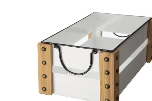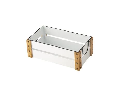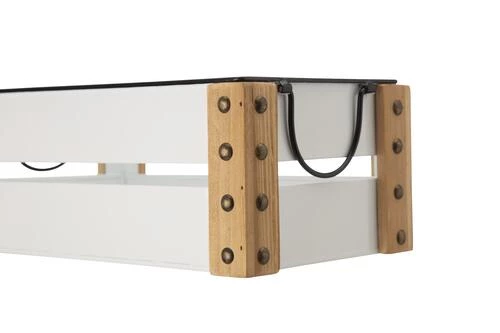 Add a bit of farmhouse charm to your home decor with this rectangular enamel metal crate. Four corners are fixed with wood, embellished with rivets. This piece offers a variation on a storage staple. Taking inspiration from vintage market crates and apple boxes, this farmhouse crate is both decorative and practical.