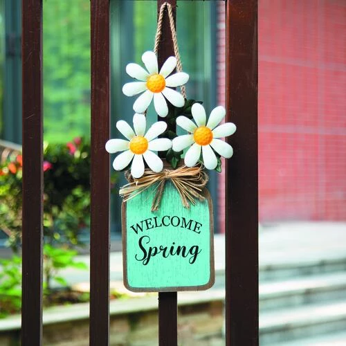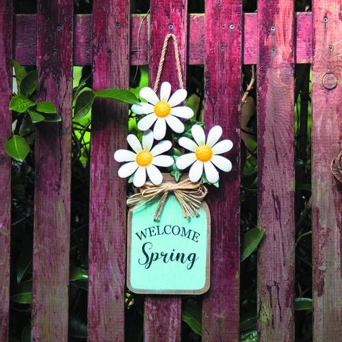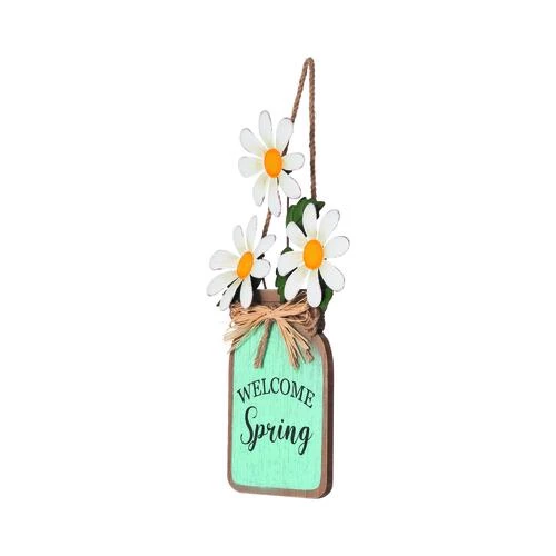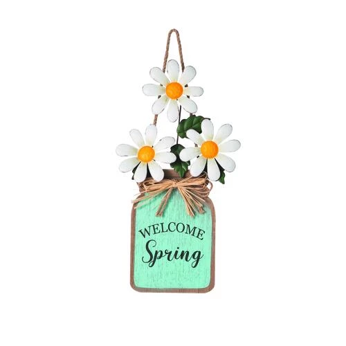 This spring decor is made of MDF and reads “WELCOME Spring”. There are 3 daisies that sit inside a jar decorated with a burlap & straw bow. Product size: 7.75″LX1″WX15″H.