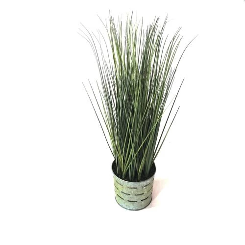 Potted in a trendy “nursery style” galvanized container, this lush faux grass is a perfect modern farmhouse accent for any indoor or covered outdoor décor. The worn look of the container perfectly contrasts with the lush green of the artificial grass to create a unique look.