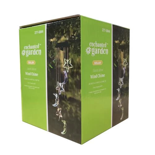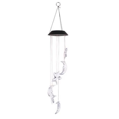 This Solar Star/Moon Wind Chime will add sparkle and fancy to your garden or porch. The solar panel uses the sun to charge up during the day, while illuminating your charming outdoor spaces with color-changing LEDs at night. Made of durable PVC, each Moon and Star is clear to showcase the beauty of the lights when light up.