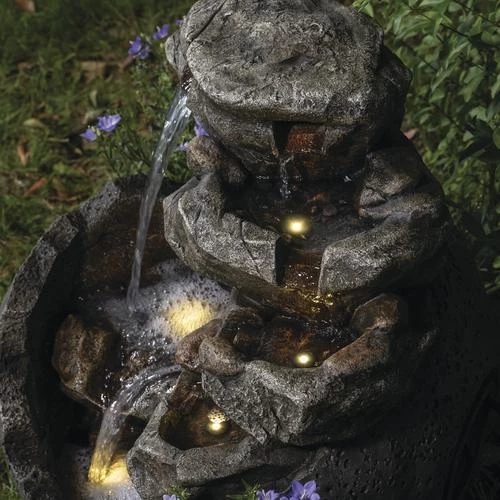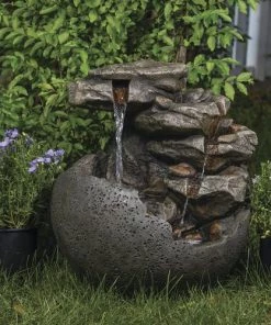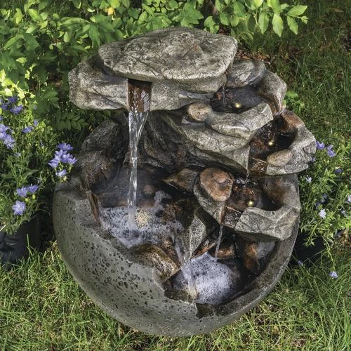 This spherical Riverview Park Water Fountain will add a beautiful dramatic element to your garden. The stepping stones of the waterfall portion of the fountain beckon you to come closer to absorb the peaceful sound it makes. Two pools of water are lit with LED lights, adding a warm glow to your fountain in a shady spot in your yard, or throughout the evening. Crafted from polyresin and fiberglass, it will last many years if stored safe from frost during the harshest Winter weather.