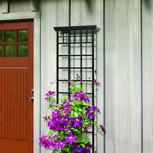 The 78 inch high Mission Trellis brings on-trend style to your garden! This trellis creates stately support for climbing vine plants, like clematis, honeysuckle and other flowering vine plants or shrubs like bougainvillea. Climbing vine plants look great winding around this trellis as they wrap around the vertical and cross bars. This trellis can stand on its own using the base stakes set in soil or set it against fencing, exterior walls or a brickwork wall. Durable steel is welded to give the trellis strength and features a powder coating for added rust resistance.