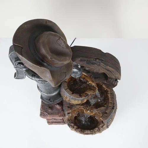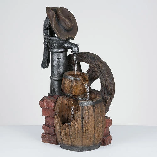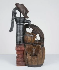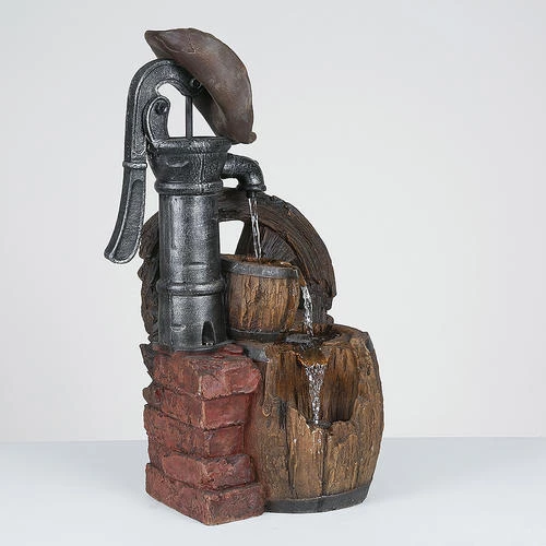 This model has a lifelike version of a water pump giving the effect that water is being pumped from the ground and into the simulated wooden bucket. Water cascades down from this smaller bucket into another bucket below it. This creates a tranquil smoothing sound for the immediate area. The attached broken wheel makes this item very rustic and will enhance any area of the yard. This item is made of fiberglass reinforced cement material. This item is made for outdoor use.