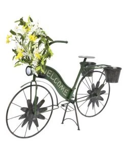 This Plant bicycle Stand, with its LED solar light and novelty design, will add a touch of whimsicality to the garden. A unique and nostalgic design, it is designed in the shape of a bicycle with intricate detailing. The planter offers storage space for one plant or pot. This Plant Peddler Stand can be placed on the porch or on the patio.