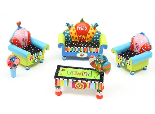 - The set includes 2 chairs with the saying “enjoy”, a table with the saying “unwind”, a big comfy couch that says “relax”, a flower pot, and an adorable owl with glasses