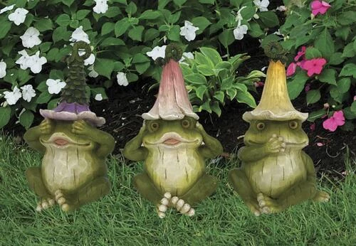 Enjoy this fun twist of see, hear, and speak no evil frog statues. Enjoy these figures in your garden, on a patio table or wherever your heart desires.
