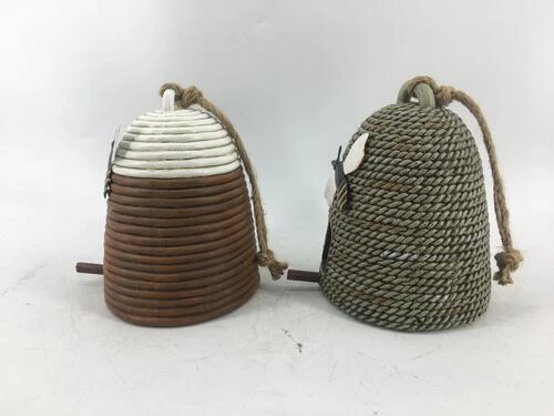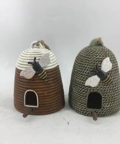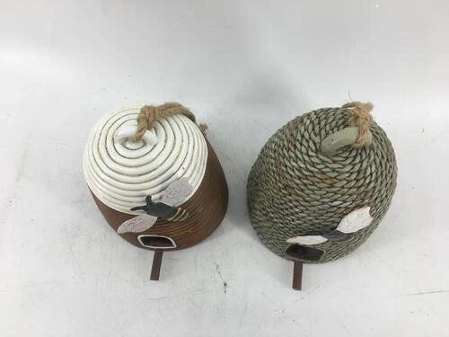 This collection of birdhouses feature a large bee hovering over the entrance. Birds are welcome inside this bee hive!