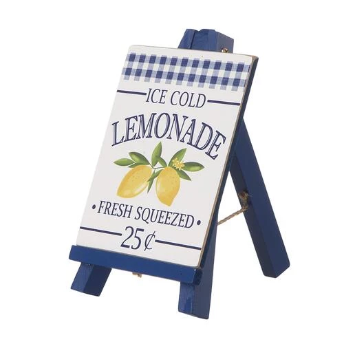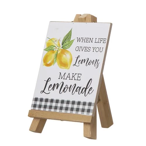 The mini wood easel is decorated with lemons & a lemonade sign.
