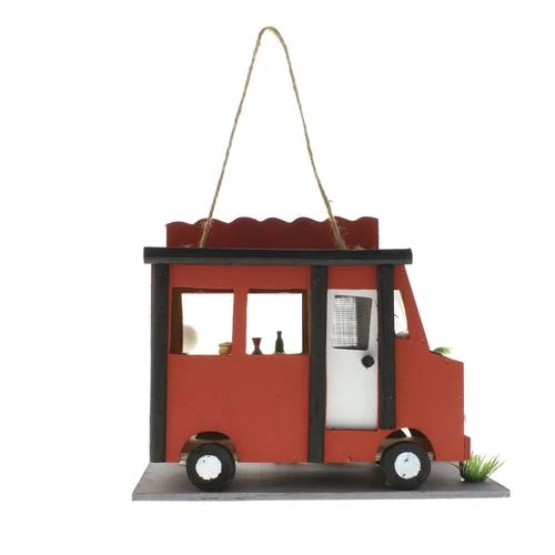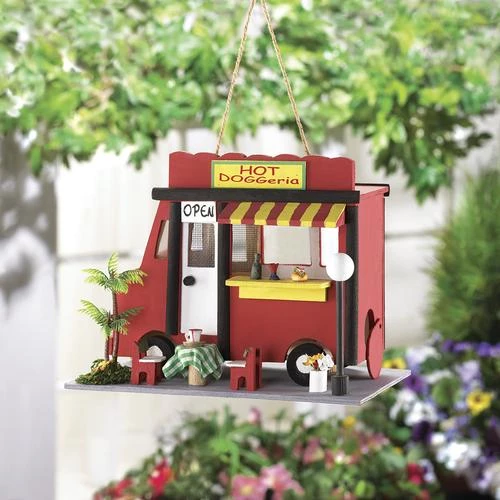 The birds will line up to get aboard this bright and whimsical wooden birdhouse. It’s shaped like a food truck, and the sign reads “Hot Doggeria.” The scene is perfectly set with a small table, condiments, and some blooming plants surrounding this hot dog restaurant on wheels.