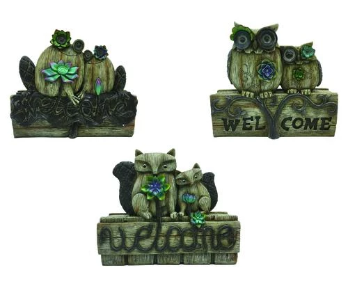 These welcome signs are hand-painted and made of durable resin designed to look like natural wood. They can be used indoors or outdoors. Choose from frogs, owls, or foxes, each sold individually.