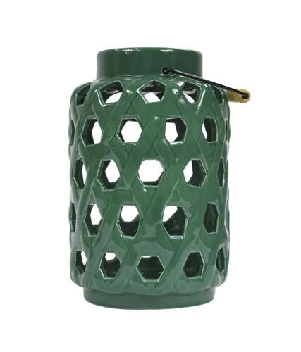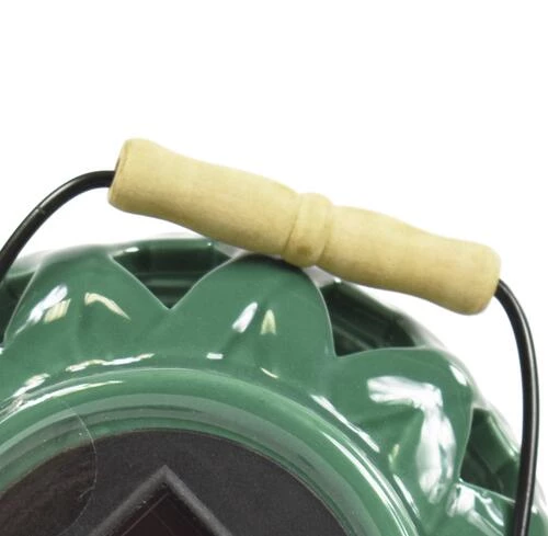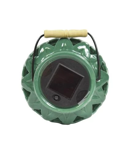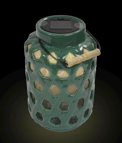 Decorate your home with this solar powered ceramic lantern with an LED light. Flame-free, smoke-free and worry-free candles let you enjoy the ambiance of candlelight safely. Made of ceramic and comes in a green. Includes a rechargeable battery and uses the sunlight to charge. Made for outdoor use.