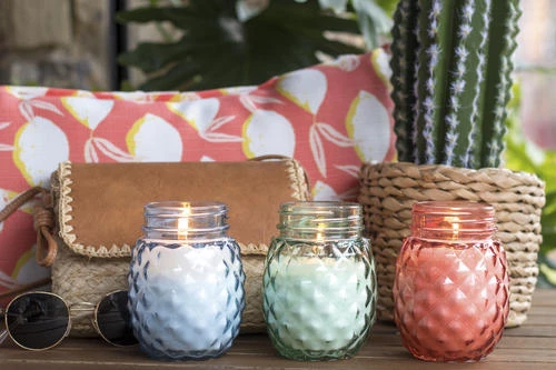 Add a fun, tropical touch to your outdoor space with these Patio Essentials 9 oz. Glass Pineapple Citronella Candles! These candles come in textured glass pineapple-shaped containers with a playful blue, green, or pink tint so that you can mix or match the colors. The subtle pineapple-shape of the container makes them perfect for light, topical pops, or you can pair them with other tropical design elements to create an oasis!