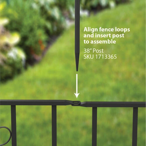 - Assemble using #1711425 fence sections, #1711426 gate and #1713365 38″ high posts