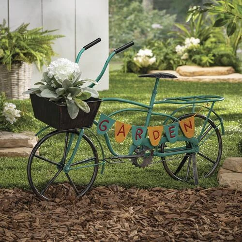 This Plant bicycle Stand, with its novelty design, will add a touch of whimsicality to the garden. A unique and nostalgic design, it is designed in the shape of a bicycle with intricate detailing. The planter offers storage space for one plant or pot. This Plant Peddler Stand can be placed on the porch, on window sills, or on the patio.