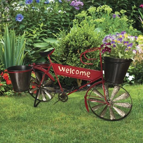 Serving both Decorative and functional purposes, this metal bicycle planter can add nostalgic whimsy to a garden, porch or patio. It comes with 3 baskets for filling with potted plants or flowers. The red bike also features text saying Welcome and has a built-on stand for good stability.