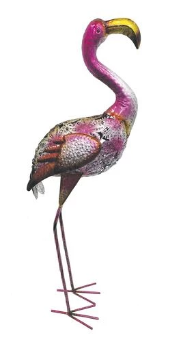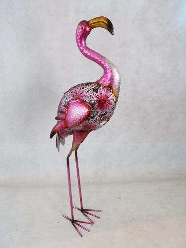 Decorate your home or your lawn with this beautiful flamingo statuary. This flamingo is made from metal and has been hand painted a metallic pink color with amazing painted details.