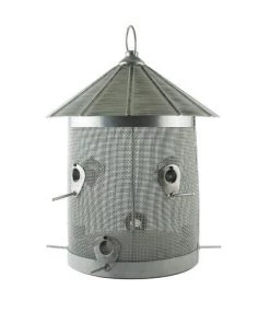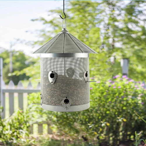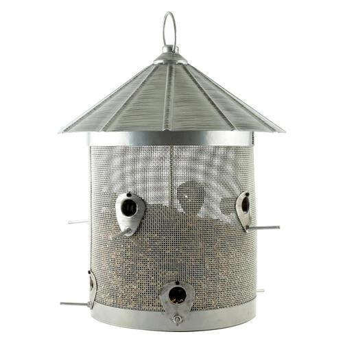 Our Rustic Farmhouse brand is on trend and incorporates popular rustic materials with functional design. The all-steel construction with vintage-look galvanized accents holds up to 10 pounds of black oil sunflower seeds, safflower seed, peanuts, or cracked corn. The steel mesh provides a sturdy structure and offers plenty of room for smaller birds to cling and dine. It is easy to fill and clean this feeder by sliding the metal roof up the included hanger. Feeder attracts cardinals, flickers, goldfinches, grosbeaks, jays, juncos, nuthatches, redpolls, sparrows, starlings, titmice, and wrens.
